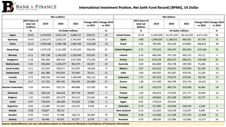 During the 2019 – 2021 period, NIIP has exhibited important changes with many of the main net creditors (as Japan, Germany, Hong Kong, Norway, Singapore, Netherlands, Switzerland, and Canada) accumulating net assets to increase their already large positive assets positions, while the United States deepening its very large net debtor position. The table in this post shows the NIIP in millions of US Dollars of the main creditors and debtors around the world and the changes between 2019 and 2021.
